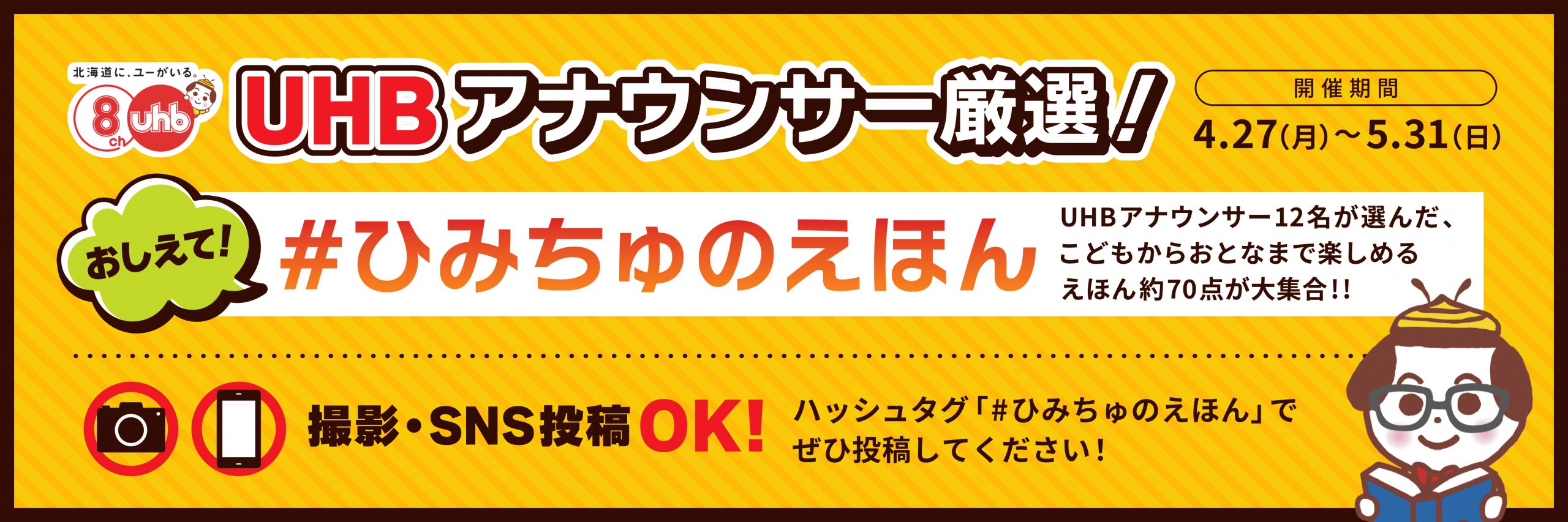 読み聞かせイベント当日の10:00~、11:00~の各30分程度、UHBマスコットキャラクター「みちゅバチ」が遊びに来てくれる予定です!